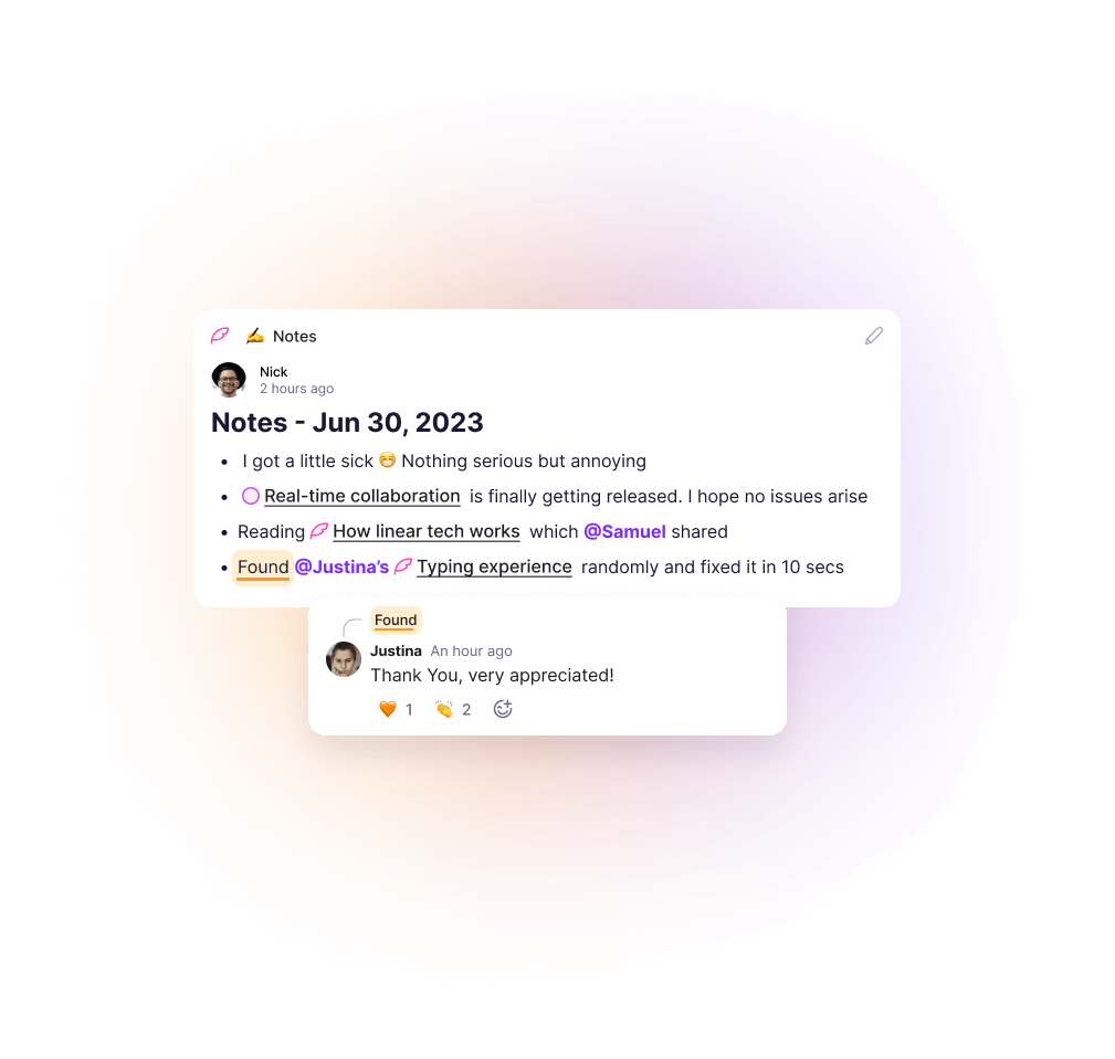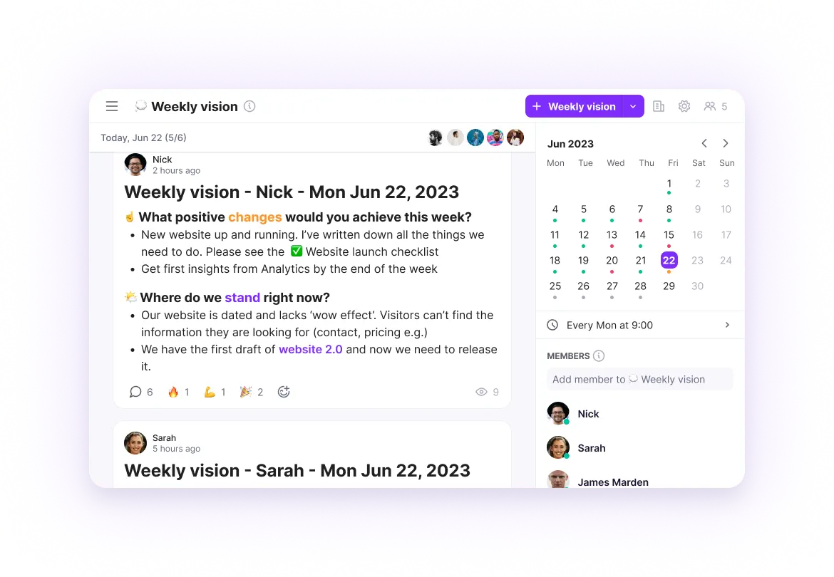 It’s best when we share our thoughts regularly. Daily notes, weekly retro, monthly review, quarterly objectives. Schedule the note-taking for your whole team and get the best results. When it works, it’s beyond words.